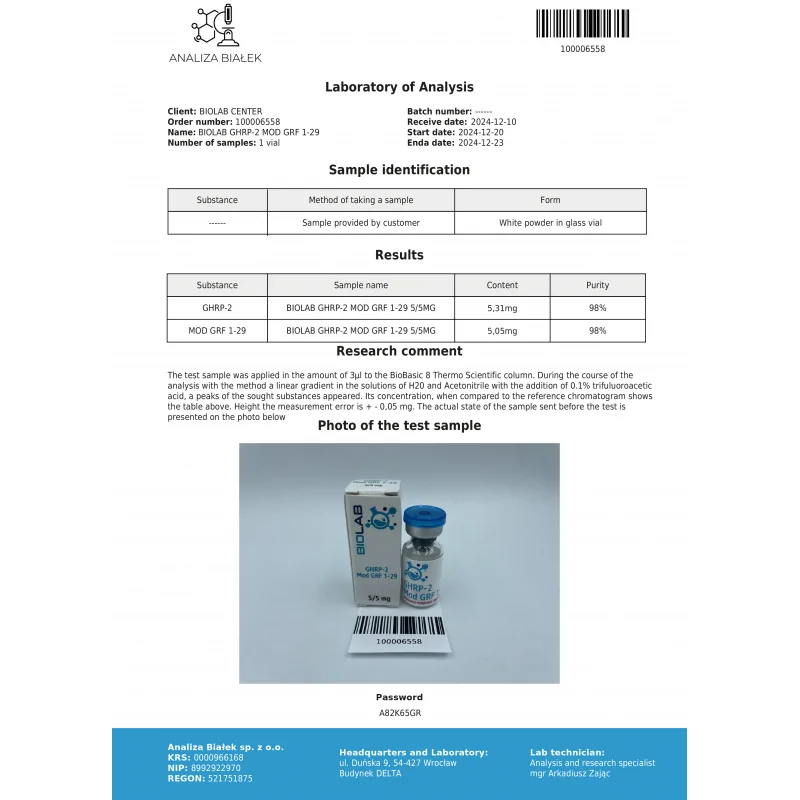 The GHRP-2 + MOD GRF 1-29 mix 5/5mg is a high-potency, research-focused peptide combination designed to support advanced studies on growth hormone signaling, tissue repair, and cellular regeneration pathways. This synergistic blend combines two extensively studied peptides: GHRP-2, a potent growth hormone secretagogue, and MOD GRF 1-29 (CJC-1295 without DAC), a stable and highly effective growth hormone–releasing hormone analog. Together, they provide researchers with a precision tool for investigating growth hormone dynamics, recovery mechanisms, and regenerative processes in laboratory and experimental models.